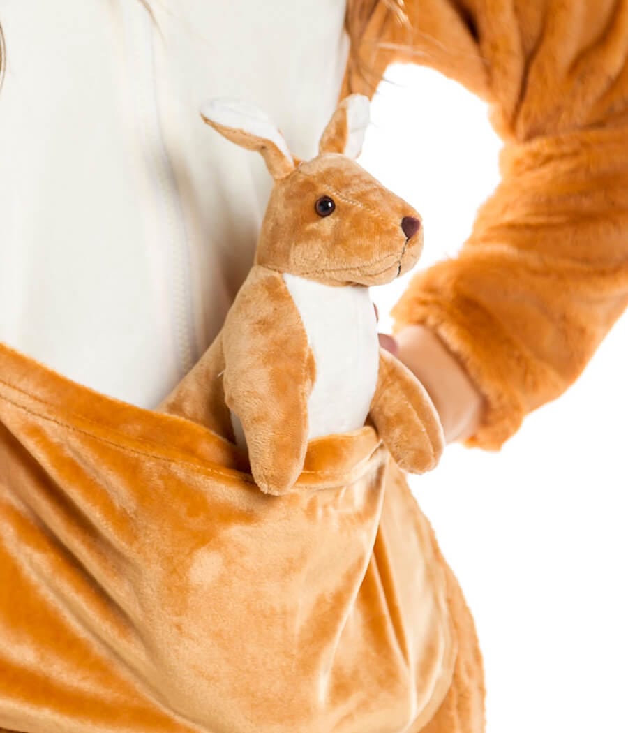 Featuring a fluffy tail and a cute baby kangaroo pouch, this costume is designed to turn heads and spark conversations at any party. With convenient hand and foot holes, it slips on just like your favorite pajamas, making it an effortless choice for any occasion.