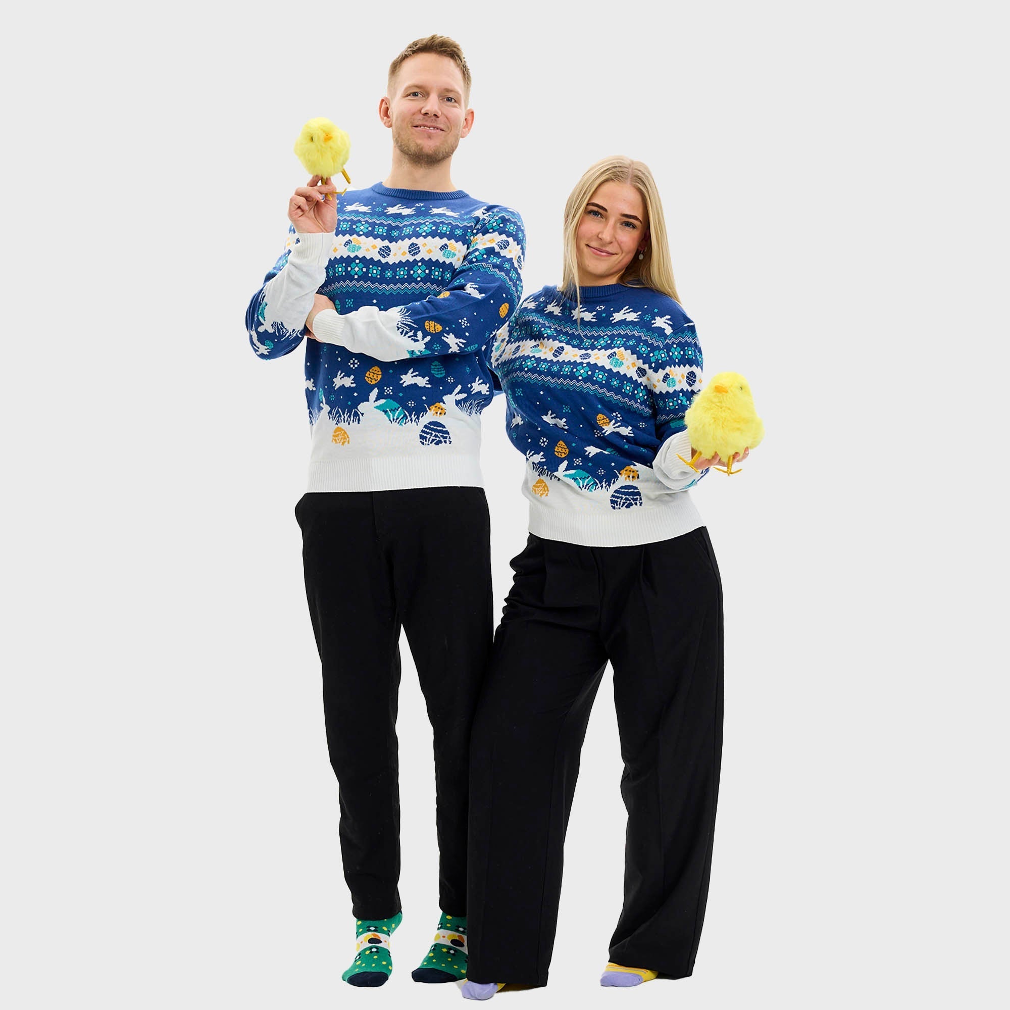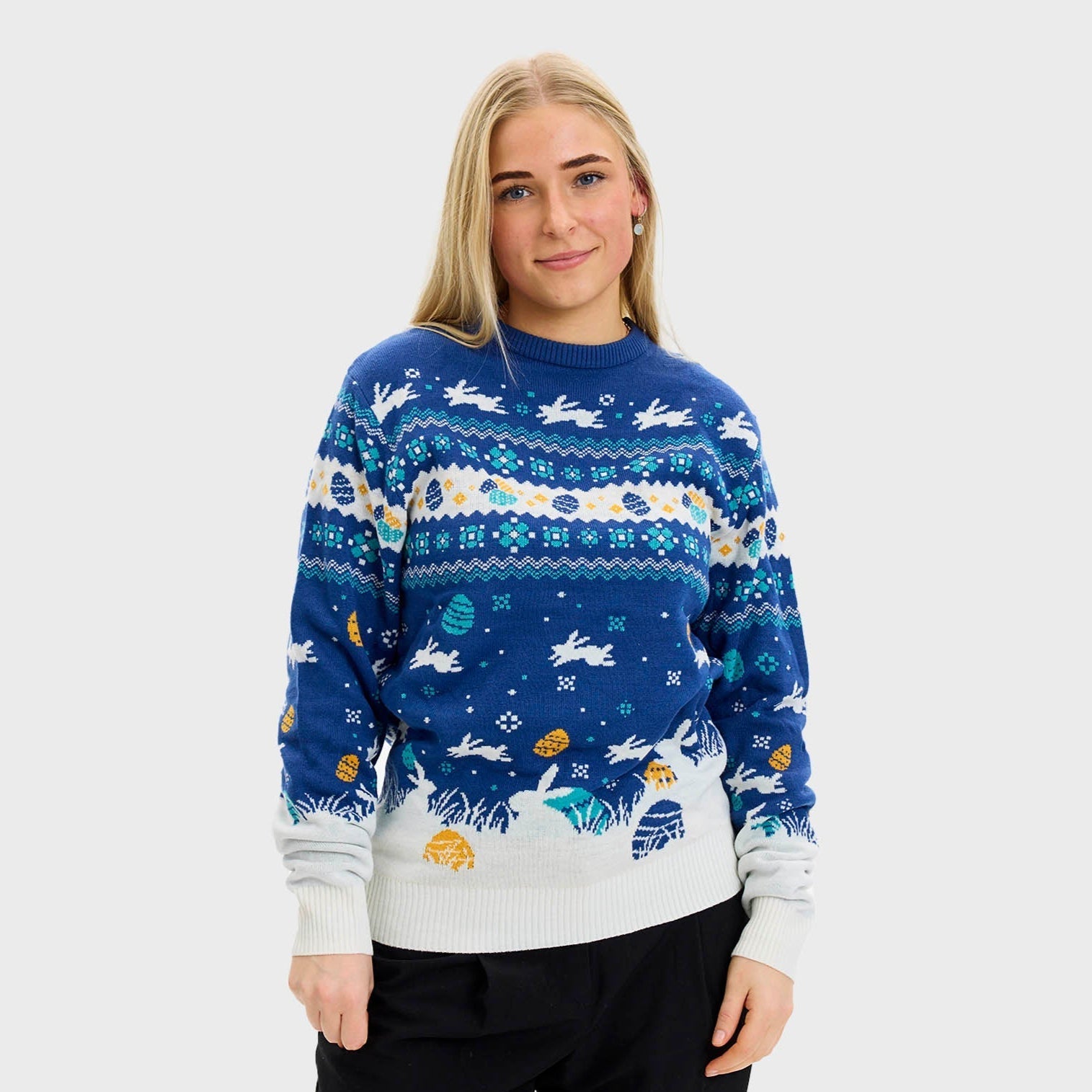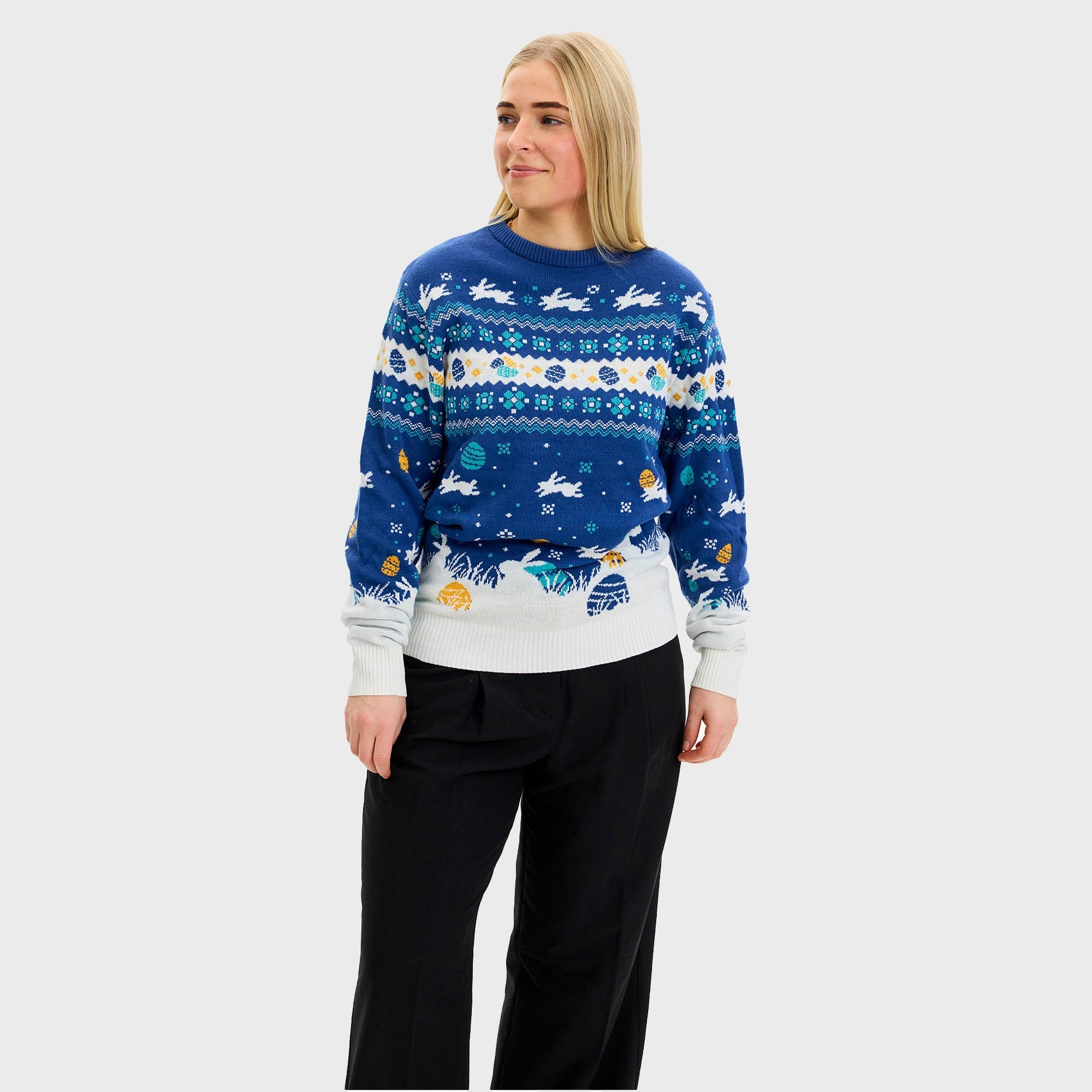 Niedlicher blauer Osterpullover – Damenversion