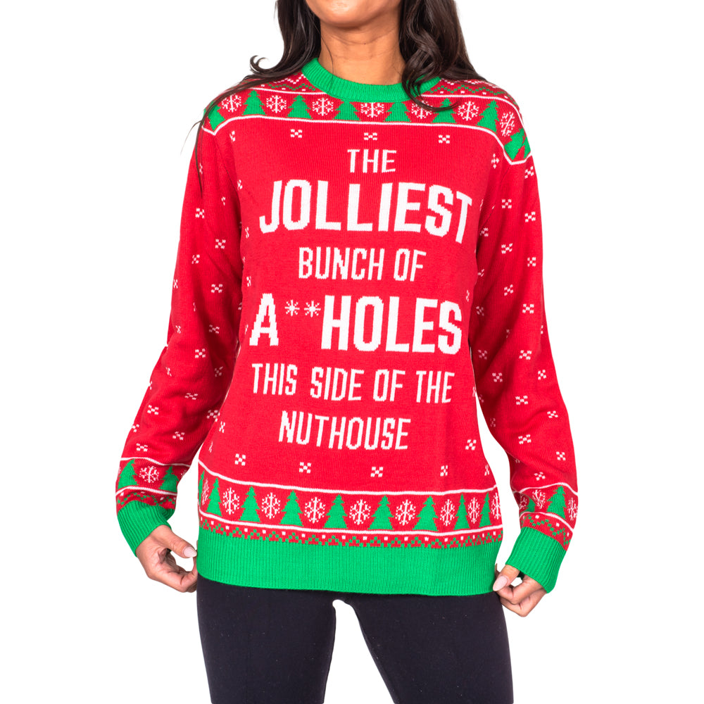 Nostalgische Weihnachtsstimmung Feiern Sie die Weihnachtsstimmung mit dem roten Weihnachtspullover „The Jolliest Bunch“, der speziell für Fans des Filmklassikers „Schöne...